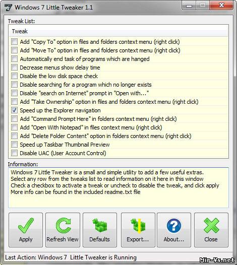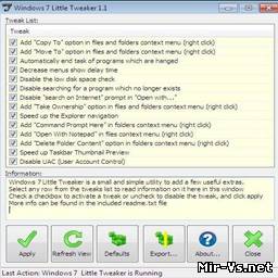 Маленький портативный твикер для 32-битной версии Windows 7, позволяющий изменить ряд скрытых параметров операционной системы. Например, активировать функцию автоматической выгрузки зависших приложений, ускорить работу «Проводника», добавить несколько полезных пунктов в контекстное меню или отключить механизм контроля учетных записей. Для самых осторожных предусмотрена возможность отката изменений и сохранение записей реестра в отдельный файл. Site=www.leelusoft.blogspot.com/2009/05/windows-7-little-tweaker.html